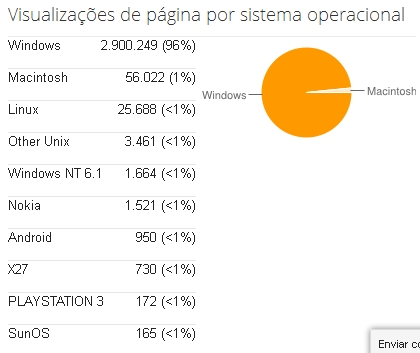 O Windows é usado por 96% dos usuários e 172 pessoas acessaram o blog via PLAYSTATION 3